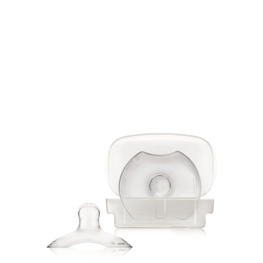 Silicone Breast Shields: Transparent, odourless and insipid. With case for microwave sterilization.