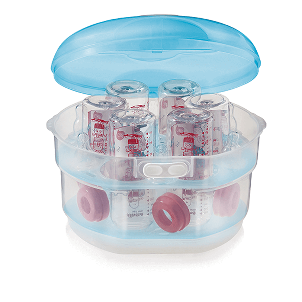 Our sterilizer makes cleaning your baby’s bottles easy. Steam sterilization is a natural and safe method, which kills 99.9% of germs without using chemicals. It is very simple, fast and safe: just add water and it is ready to sterilize in the microwave. You can sterilize up to 6 bottles at a time.