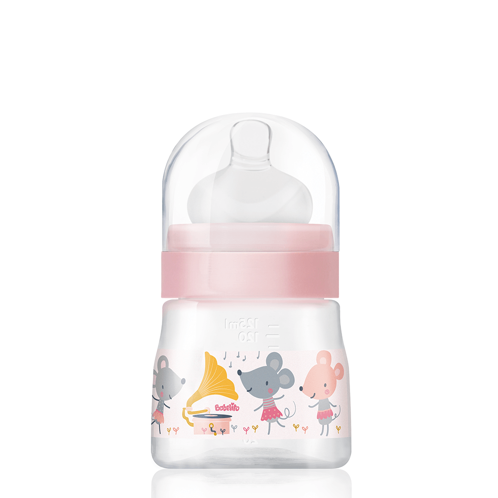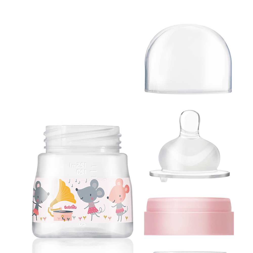 Our wide mouth bottle has a capacity of 125 ml and is available in teat size 1. Its exclusive SuperSoft teat has an air valve at the base: the air is directed towards the ventilation valve and enters the bottle, causing a constant exit of food, minimizing air intake and thus reducing the risk of colic and hiccups for your baby.