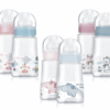 Our wide neck bottle comes in 3 teat sizes: 1, 2 and 3. Its exclusive EasyFlow teat has an air valve at the base: the air is directed towards the ventilation valve and enters the bottle, causing a constant exit of food, minimizing air intake and thus reducing the risk of colic and hiccups for your baby.