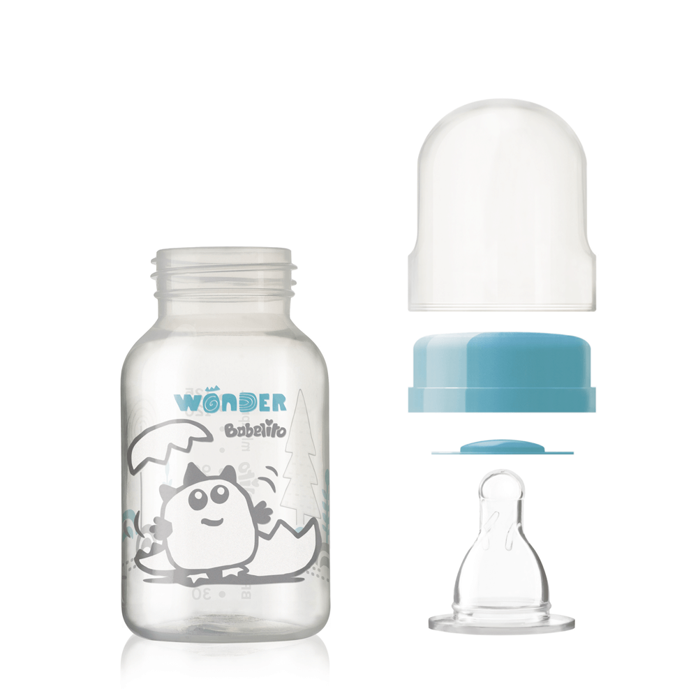 Materiales: Botella, tapa, rosca y capuchón: PP / Tetina: Silicona.
