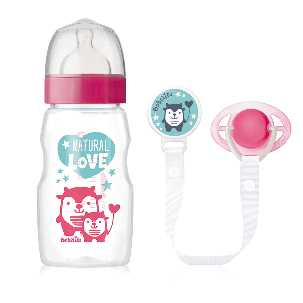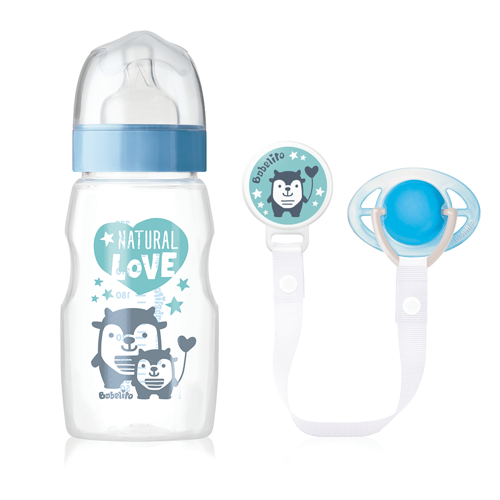 Biberón: con boca ancha, capacidad de 270 ml, con tetina de silicona tamaño 1. La amplitud de la boca de la botella, facilita su limpieza. Además, el capuchón del biberón, actúa como un tope para la tetina, para prevenir el derrame de líquido.